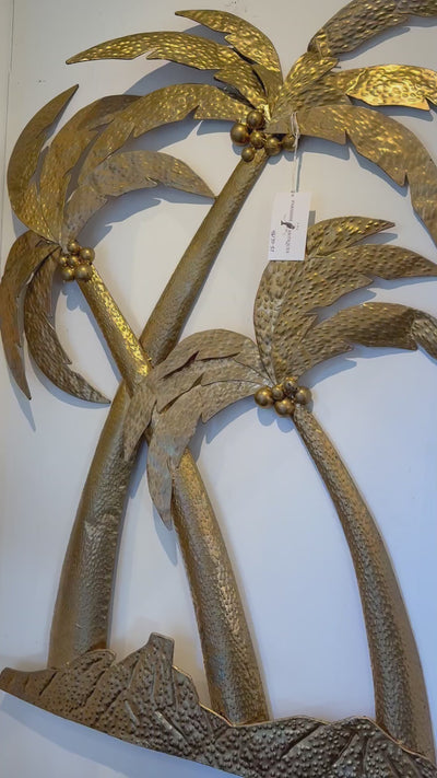 French vintage 1970's decorative wall metal Palm Trees plaque, antiqued gold/brass finish. Very popular in the French riviera boutiques and homes, tropical and exotic mid century modern decor.