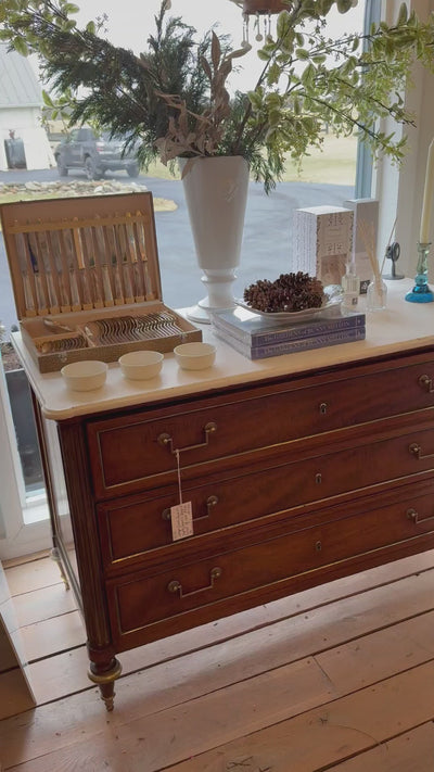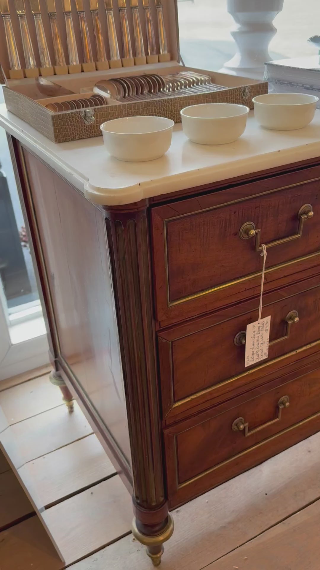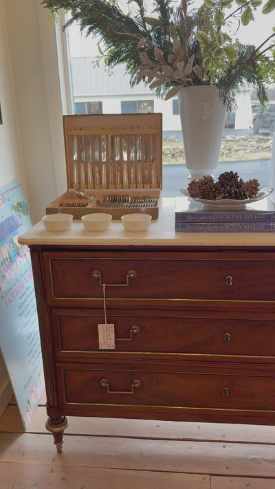 Antique French Louis XVI Chest of Drawers, Bronze Detail, Off-White Marble Top