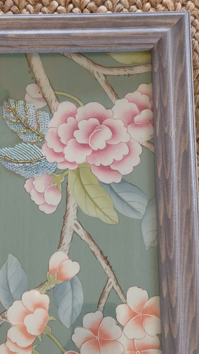 This Chinoiserie panel showcases delicate hand-painted flora and fauna on silk, executed using the 2,000 year-old Gongbi Chinese technique. Hand embroidery embellishment applied to enhance texture. An exquisite fusion of artistry and craftsmanship. Framed in softly weathered blue wood.