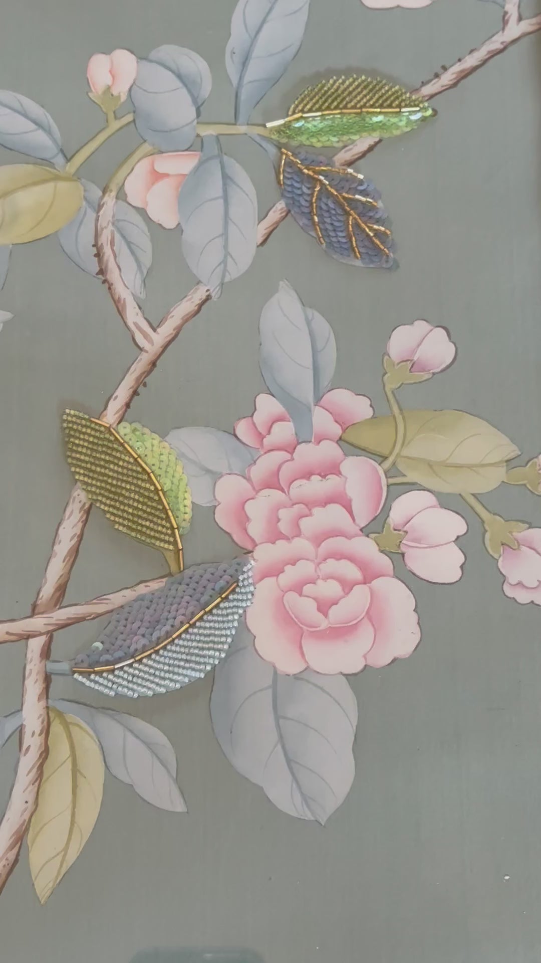 This Chinoiserie panel showcases delicate hand-painted flora and fauna on silk, executed using the 2,000 year-old Gongbi Chinese technique. Hand embroidery embellishment applied to enhance texture. An exquisite fusion of artistry and craftsmanship. Framed in softly weathered blue wood.