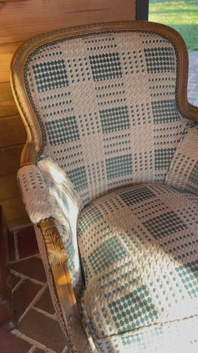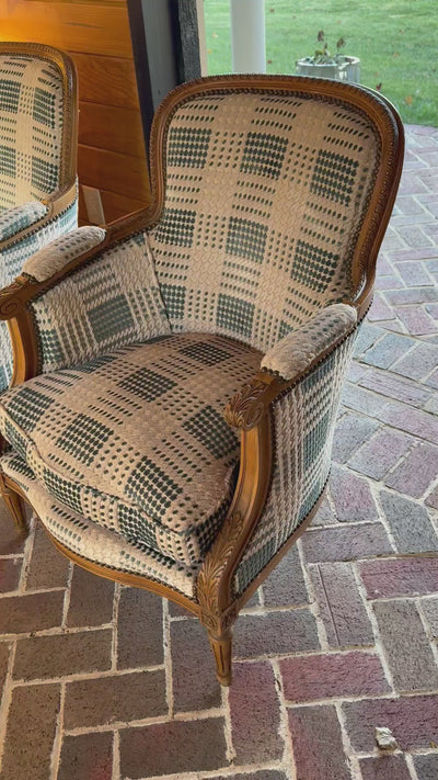 Pair of French Bergères, beautiful blond wood. Reupholstered in teal blue and cream chenille.