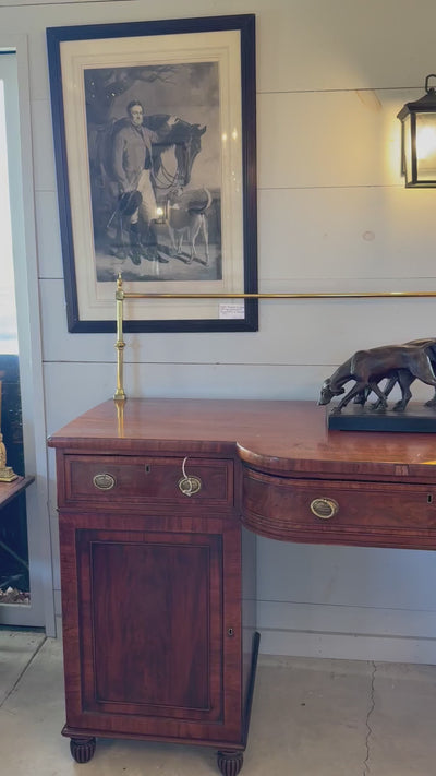 This mahogany sideboard features exquisite inlaid embellishments characteristic of the period. The piece is appointed with an authentic brass gallery rail—a practical design element typical of 19th Century English sideboards, that accommodates serving linens and utensils while adding architectural interest.