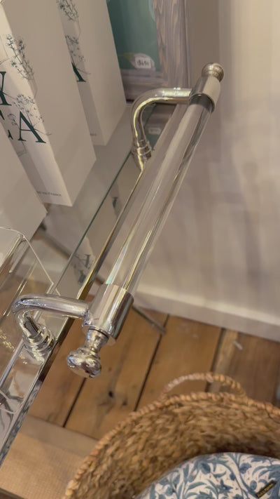 This Italian dessert cart from a San Remo hotel epitomizes 1970s design with its refined silver frame and glass shelves. It would fit into any home as a bar cart, beverage station, or accent table. Pair two carts for a striking display, or let a single piece anchor your space with vintage sophistication and functional beauty.